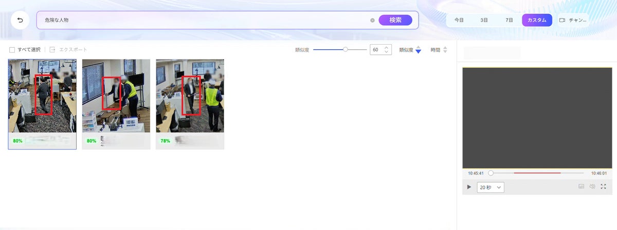 「誰が」「いつ」「どこで」「何をした」といった具体的な事象から、「赤い服の人が〇〇に入った」「特定の場所で物が倒れた」など、自然言語で直感的に検索条件を設定できます。専門的なITスキルは不要で、現場の状況に合わせた柔軟な検索を可能とします。さらに、この高度な検索機能により、ギガバイト単位の膨大な過去動画の中から、必要なシーンを瞬時に特定し、超高速検索を実現します。