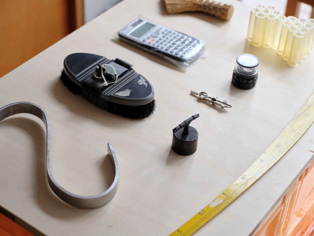 展示では、江東区のものづくり企業6社で実際に使用されている道具を紹介します。墨田川造船株式会社のS字フック、精研硝子株式会社の巨大ルーペ、株式会社田丸製作所の業務用マグネットなど、製造背景を物語る道具たちが並びます。