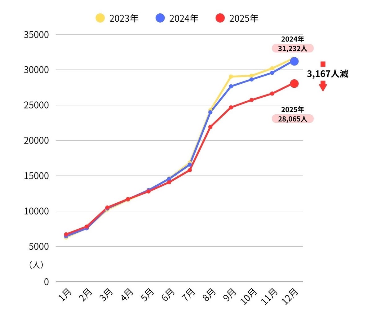 米商務省国際貿易局のデータによると、2025年の日本人学生ビザ保持者の米国入国数は前年比で約3,000人の大幅減となりました。これは2025年5月以降のトランプ政権による留学生への審査厳格化やビザ発給制限の動きが影響した可能性が高く、欧米留学の不透明感、治安の不安定感、さらには円安・物価高が深刻な障壁となっています。