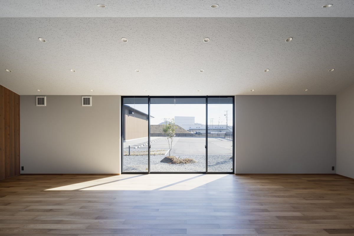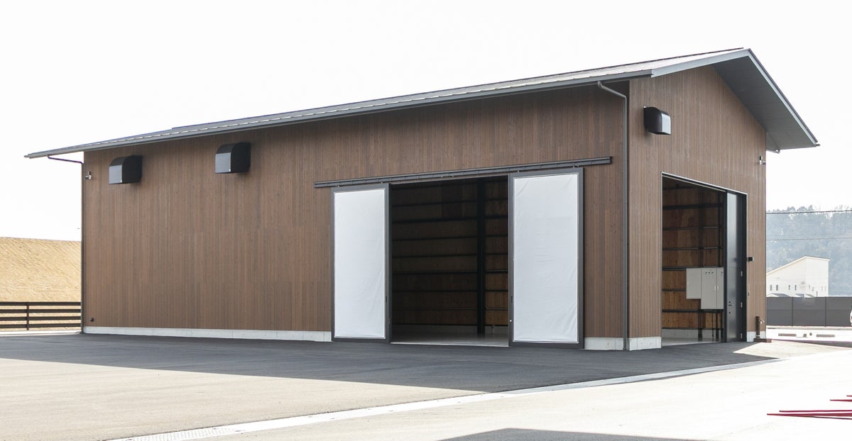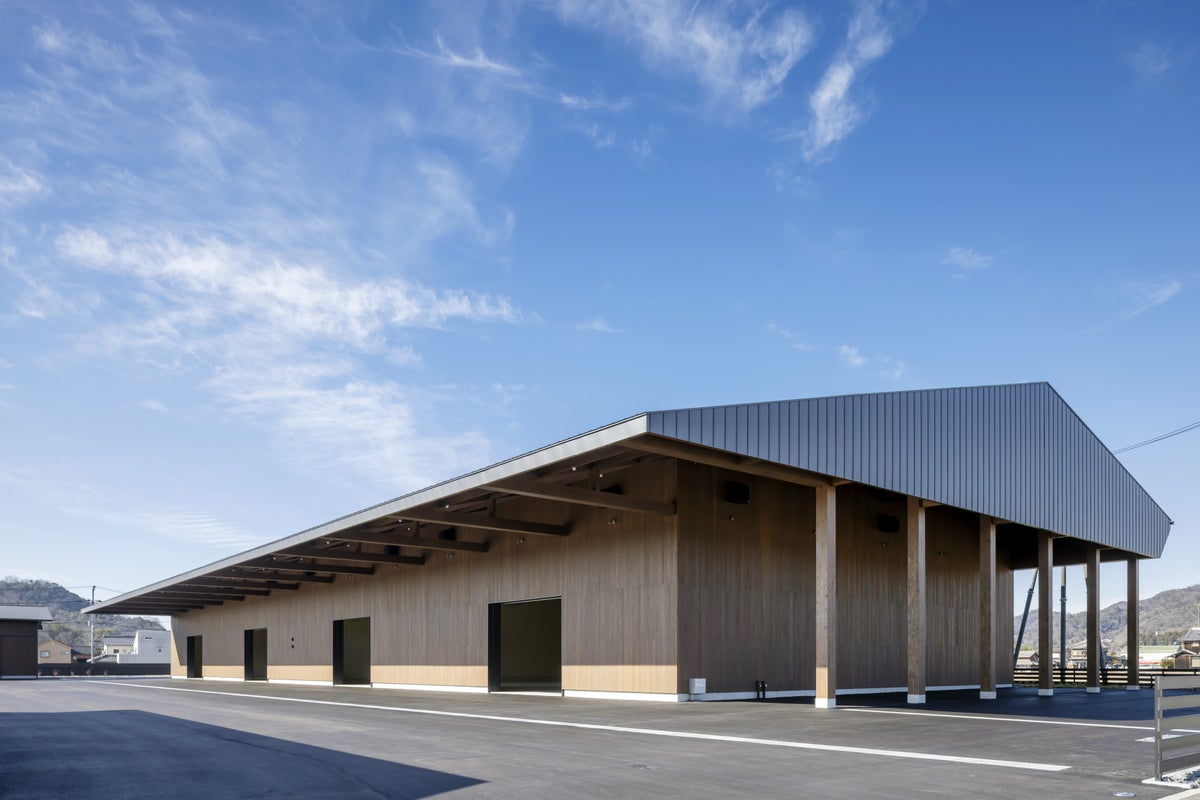 【営業用倉庫棟】約550坪、トラス工法による柱のない梁下約9mの開放的な空間。構造材は39cm角(万博の大屋根リングとほぼ同サイズ)。建築基準法に基づき、防火壁で二部屋に区画。再生可能エネルギーを使用して、"ゼロカーボン倉庫"を目指した運用を予定。