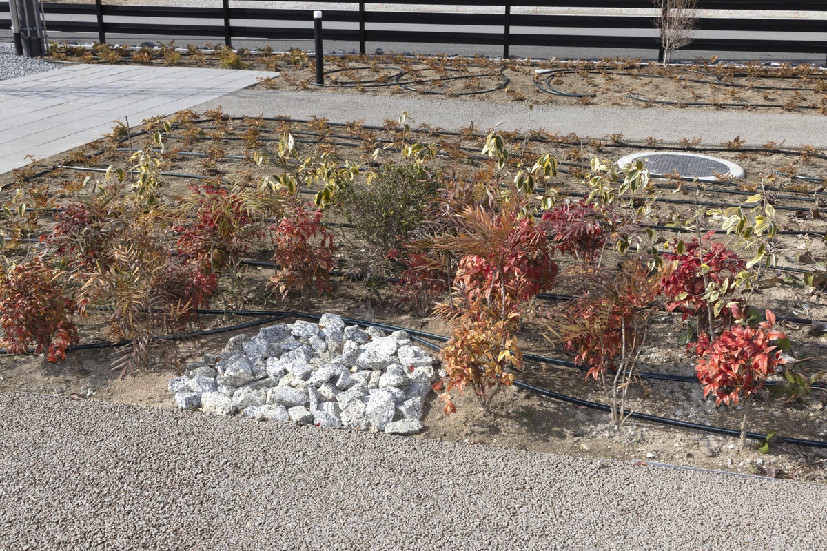 【植栽エリア】万博植栽、雨水循環システム、ビオトープ、遊歩道。大阪・関西万博でサステナブル賞を受賞したルクセンブルクパビリオンから、ルクセンブルク政府の審査を経て譲り受けた植栽を配置。万博で使用された雨水ろ過用の石も、雨水タンクの隣に設置している。加西市・網引(あびき)湿原の在来種も植える予定。