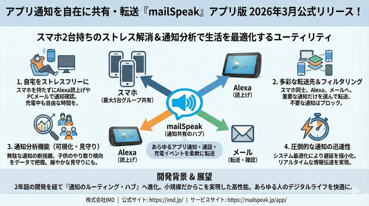 株式会社アイ・エム・デイ(IMD 本社:東京都港区、代表取締役社長:峯尾 淳一)は、2023年5月の初期リリースから2年以上の開発期間を経て、スマートフォンのあらゆるアプリ通知や通話イベント・充電イベントを、指定するデバイスやメール・Alexaへ柔軟に転送・共有できるAndroidアプリ『mailSpeak(メールスピーク)』を2026年3月に公式リリースいたします。