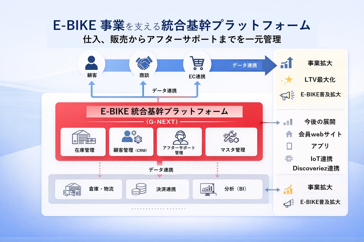 ジーネクストは、その事業成長を支える中核基盤として、販売・在庫・顧客・アフターサポートを一元管理するE-BIKE特化型基幹システムを構築しています。