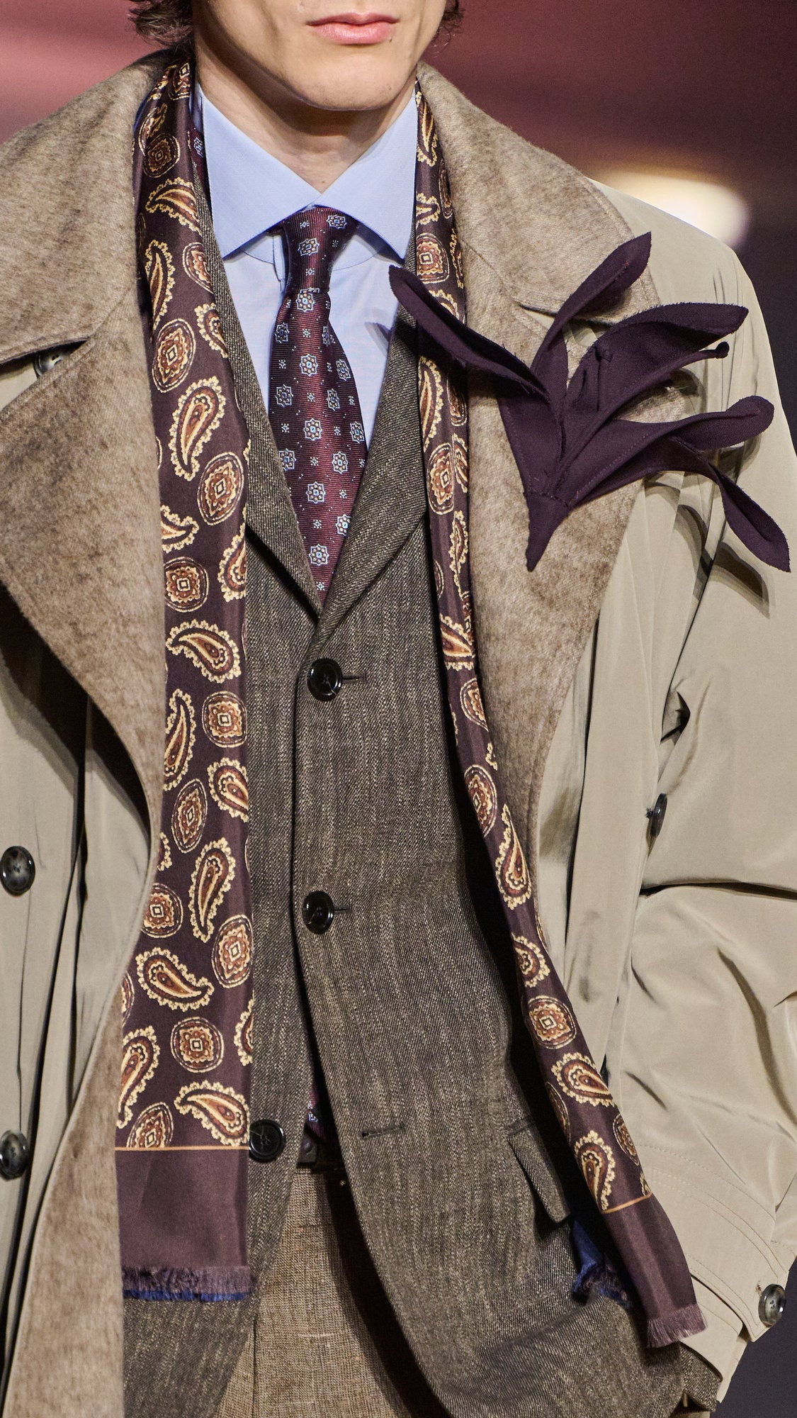 プリントシルクやジャカードで表現されたアーカイブ由来の装飾は、ネクタイ、ポケットスクエア、スカーフ、カマーバンドに用いられ、牡丹、カラーリリー、ユリといった新たなフローラルモチーフへと再構築されました。これらは昼夜を問わず、テーラードジャケットやコートとともにスタイリングされます。