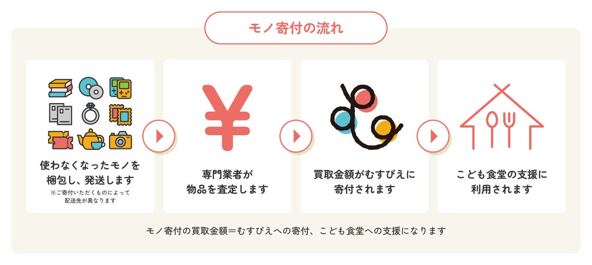 「モノ寄付」とは、ご自宅やオフィスに眠るモノ(本やDVD・切手・はがき・貴金属など)をお送りいただき、その買取金額(お金)がむすびえに寄付され、全国のこども食堂を支える活動に活用される仕組みです。