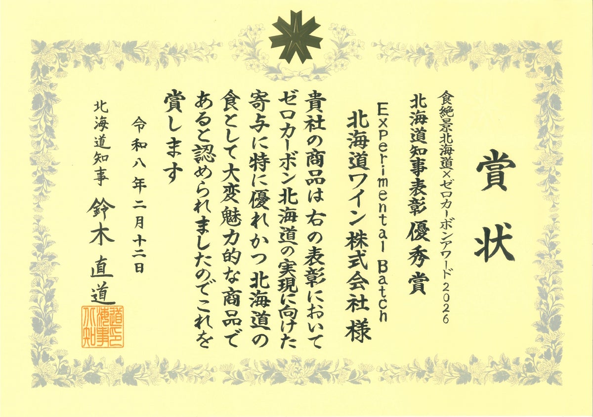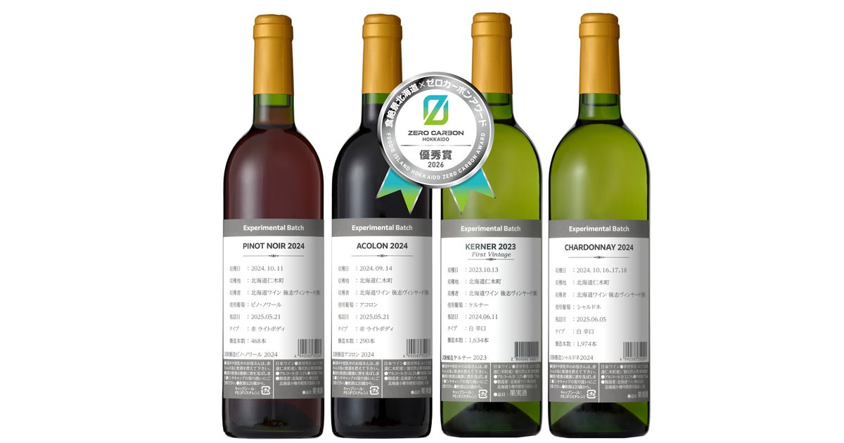 北海道ワイン株式会社(本社:北海道小樽市、代表取締役社長:嶌村公宏、以下「当社」)は、直轄農場である「北海道ワイン後志ヴィンヤード」(北海道仁木町、以下「後志ヴィンヤード」)で栽培されたぶどうを原料に醸造した、試験醸造ワインシリーズ「Experimental Batch(エクスぺリメンタル バッチ)」が、「食絶景北海道×ゼロカーボンアワード2026」(主催:北海道)で北海道知事表彰 優秀賞を受賞いたしましたことをお知らせいたします。