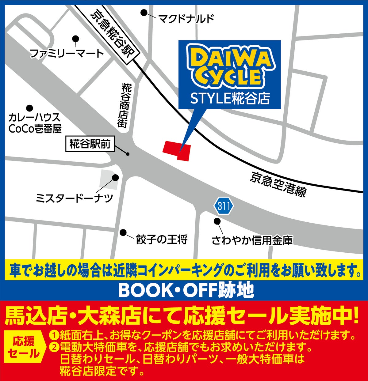 ダイワサイクルSTYLE糀谷店は羽田空港へ続く京急空港線の糀谷駅前、BOOK・OFFの跡地に開店いたします。駅から徒歩1分と近く、通勤通学やお出かけの際にお立ち寄りいただきやすい店舗となっております。ダイワサイクル以外でご購入になられた自転車でも修理可能ですので、空気入れ・お困りごとなどありましたらお気軽にお立ち寄りください。