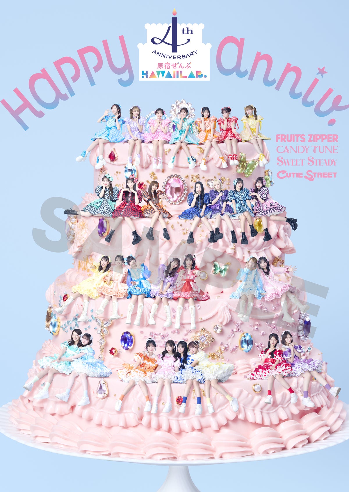 原宿エリア36箇所に、KAWAII LAB.所属のFRUITS ZIPPER、CANDY TUNE、SWEET STEADY、CUTIE STREETのポスタービジュアル全249枚を展開。総勢29名のソロショットに加え、発売中のベストアルバム『KAWAII LAB. BEST ALBUM』のジャケットでも印象的なバースデーケーキビジュアルや、各グループの集合ショットも登場します。街を歩けば、あちこちでメンバーの姿と言葉に出会える--そんな“ビジュアル+言葉ジャック”。ポスターには、ベストアルバム収録曲「CHU CHU CHU研究中!」の歌詞にも登場する「“KAWAII”ってなに?」という問いに対するメンバーそれぞれのアンサーを掲載。ビジュアルと言葉を通して、4年間の軌跡と一人ひとりの個性を感じられる企画となっています。ぜひ原宿の街で、29名それぞれの“KAWAII”を探してみてください。