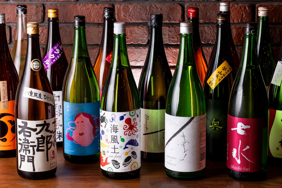 全国各地から厳選した日本酒を常時取り揃え、純米・純米吟醸を中心に、季節ごとに入れ替わる地酒を展開。「十六代九郎右衛門 純米」、「宮寒梅 純米大吟醸」、「雨降 水もと生原酒 無濾過」など、魚料理との相性を考えた銘柄構成としています。