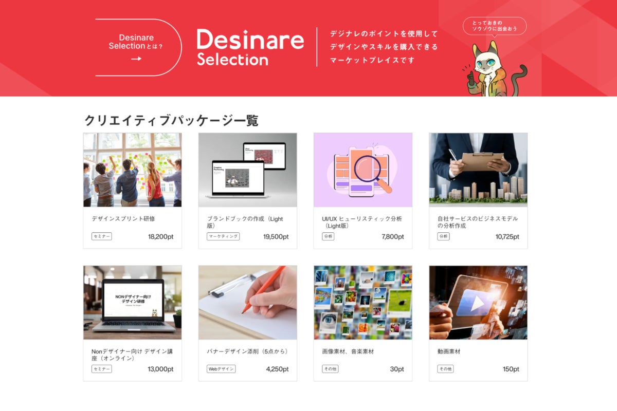 「デジナレ セレクション」は、“とっておきのソウゾウに出会おう”をコンセプトに、ネクスキャットが多くのお客様の課題解決を通じて培ってきた経験と知見をもとに誕生した、過去の制作物やノウハウを型化した「クリエイティブパッケージ」のマーケットプレイスです。