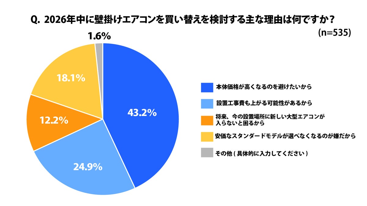 買い替え意向のある「強くそう思う」「ややそう思う」という方の中で、買い替えを検討する理由としては、「本体価格が高くなるのを避けたい」が多数、次いで「設置工事費用も上がる可能性があるから」という、買い替え需要の増加による、設置工事費用の値上がりの懸念も考えられます。