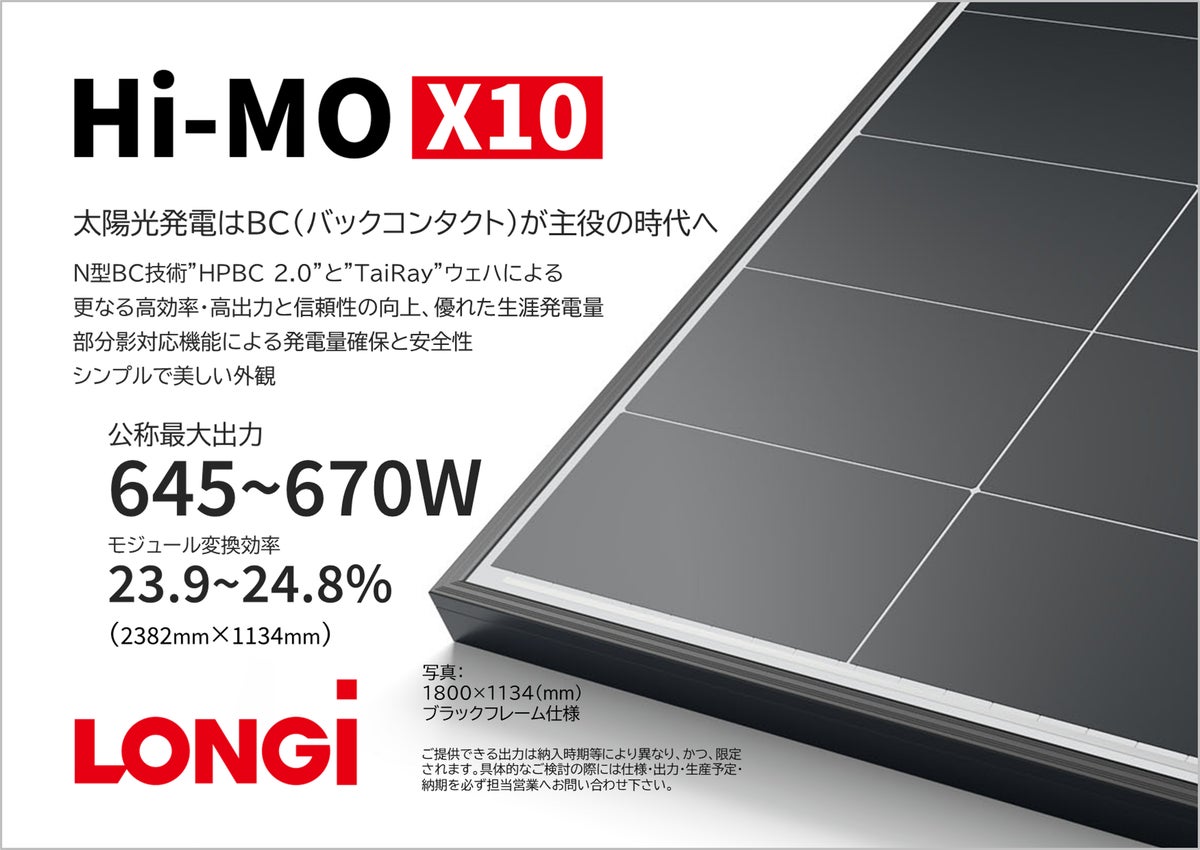 当社ブースでは、今後の日本の太陽光発電市場において中心的な役割が期待される屋根上設置向け製品として、N型BC(バックコンタクト)技術を採用した「Hi-MO X10」を展示します。軽量タイプ、防汚タイプ、防眩タイプに加え、500mmピッチの折板屋根に適したモデルなど、充実のラインナップを一堂にご紹介いたします。ぜひ弊社ブース(東4ホール/No. E3-50)へお立ち寄りください。