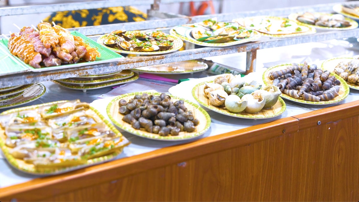 グルメを探していると…タニシやカエルなど、日本ではあまり見ないものも!