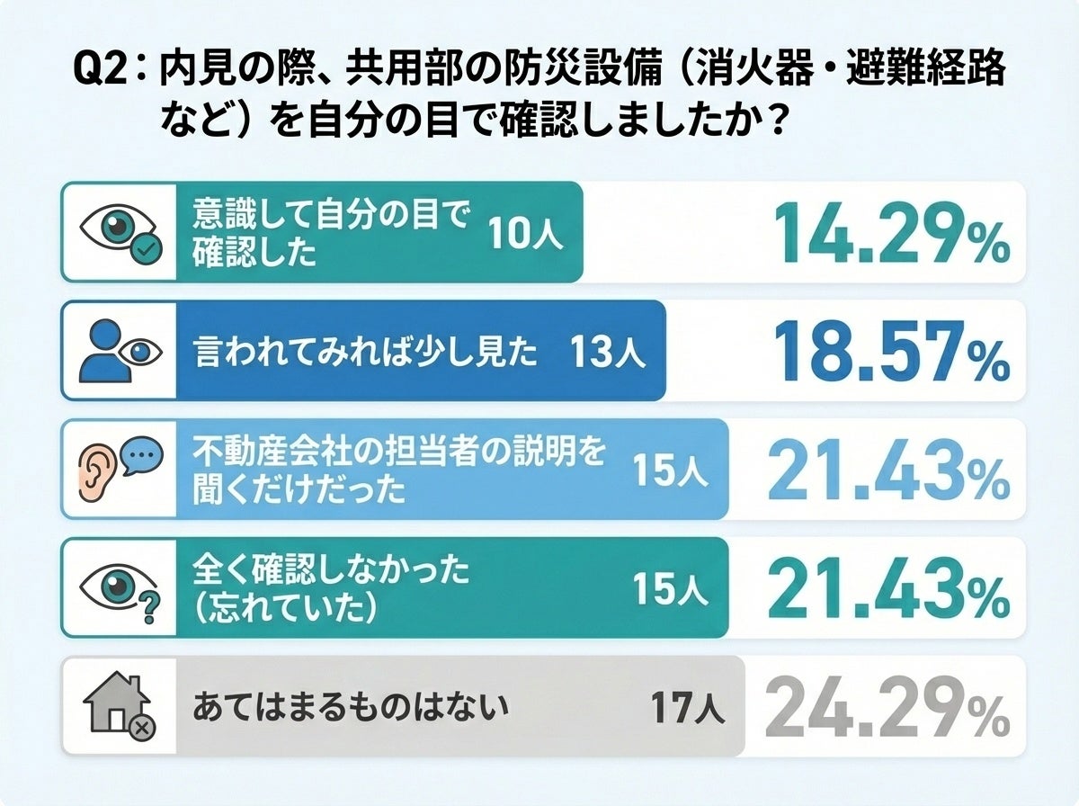 内見の際、共用部の防災設備(消火器・避難経路など)を自分の目で確認したかを尋ねたところ、「意識して自分の目で確認した」と回答した人は10名(14.29%)にとどまりました。