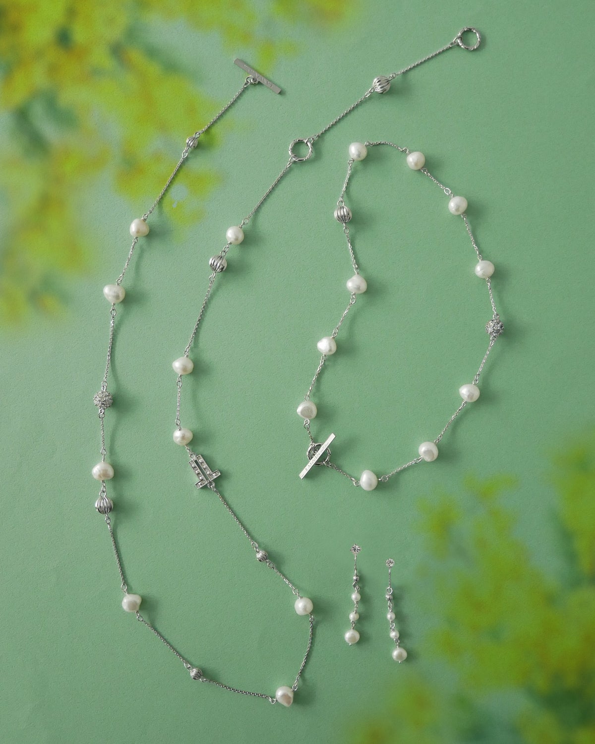 マーガレットのつぼみをイメージしたメタルボールやパヴェボールをリズミカルに配したネックレスとブレスレット、縦長シルエットがスタイリッシュなピアス・イヤリングが揃う、モードな雰囲気のラインナップ。上品さと軽やかさを兼ね備え、オケージョンシーンはもちろんデイリーにも活躍。ロングネックレスは途中のサークルパーツを使用してY字ラインにもアレンジでき、スタイリングに合わせて多彩な表情を楽しめます。