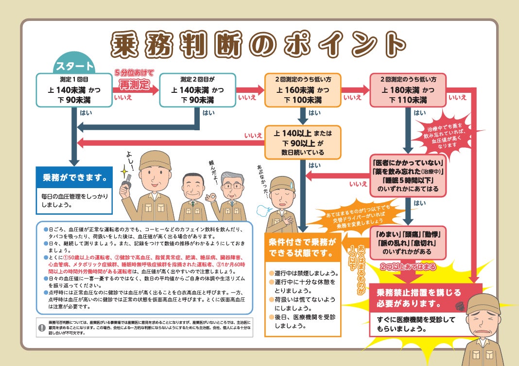 全日本トラック協会より、点呼における血圧測定のガイドラインが配布されています。日々血圧を測定することが推奨され、乗務可否の業務フローも示されています。