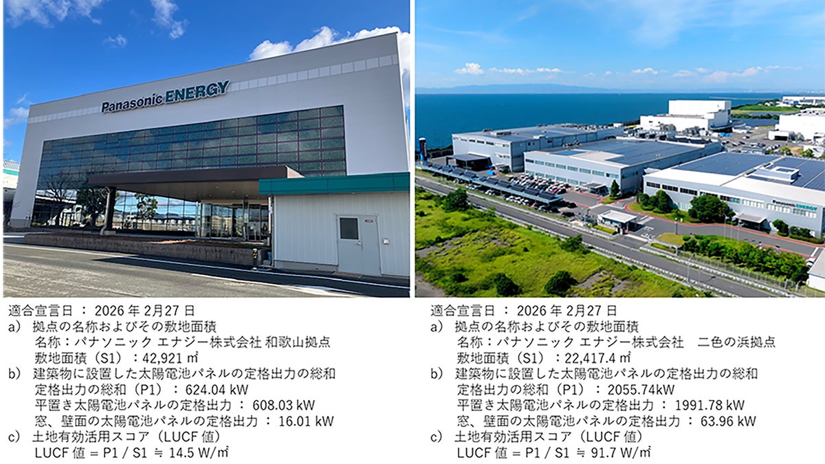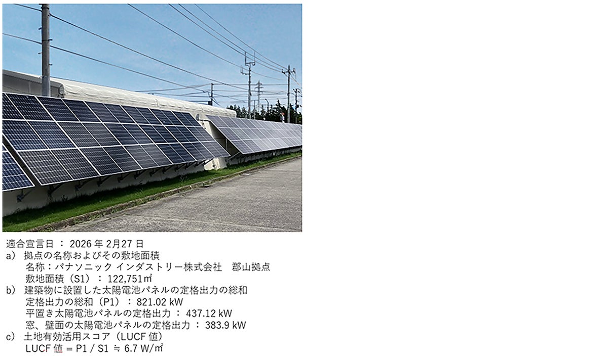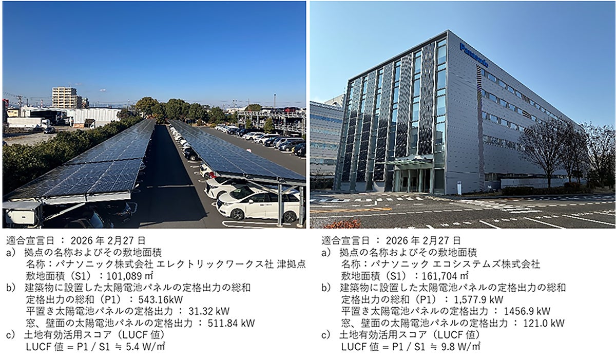 パナソニックグループは、国内工場の5拠点において、日本規格協会が発効するJSA規格S1024「太陽電池パネルを設置した建築物等の土地有効活用スコアの評価方法」に基づき評価を実施し、「土地有効活用型PV設置建築物等」(※1)に適合しました。