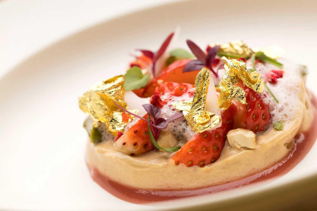 黒砂糖とクルミ、味噌で作った餡を小麦粉の皮で包んだ青森のおやつ「きんかもち」を、甘酸っぱいイチゴのデザートに昇華させました。シナモンやアニスが香るフレンチトーストに、イチゴのソースと、黒砂糖やナッツ、味噌のコクを加えたホワイトチョコレートムースを重ね、ベリーの泡やハーブで飾り付けしました。最後にあしらった金箔は、「きんかもち」の由来である金貨を表現しています。