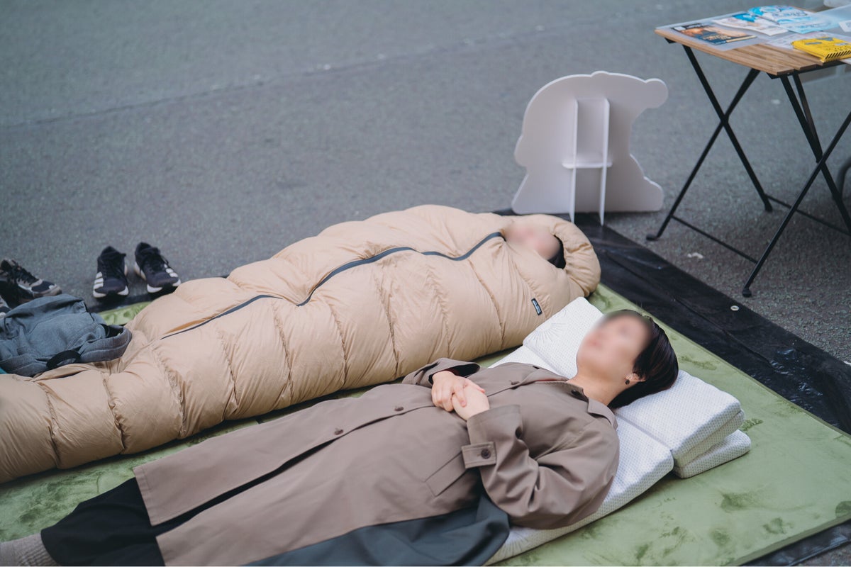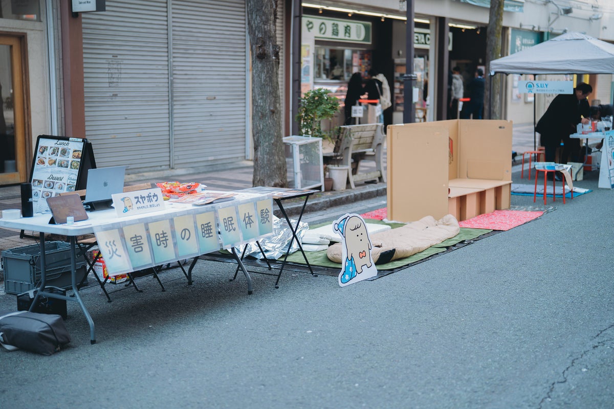 【地域イベントを通じて「避難生活の質」に着目】本イベントでは、マルシェや地域企画も同時開催され、地元住民が気軽に防災に触れられる機会となりました。会場では、避難生活を想定した睡眠環境を体験できるブースを設置し、実際の寝心地を体感いただきました。