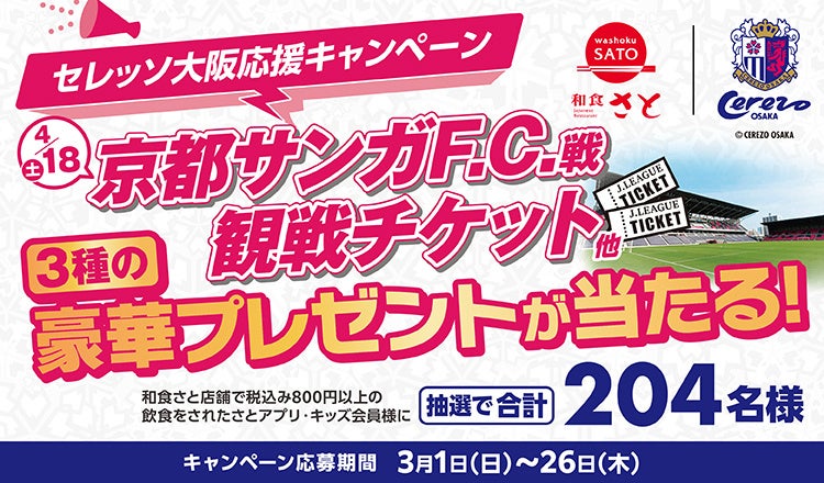 国内201店舗を展開する「和食さと」は、創業地である大阪を代表するプロサッカークラブ「セレッソ大阪」を、ゴールドパートナー企業として応援しております。このたび、セレッソ大阪応援キャンペーンの一環として、抽選で各賞合計204名に当たる豪華プレゼントキャンペーンを開催します。今回は「観戦コース」または「グッズコース」の各コースを選んで応募いただけます。【観戦コース】では[金賞]として、4月18日(土)開催の京都サンガF.C.戦をホームバック南B指定席で観戦できるペアチケットを50組100名様にプレゼント!さらに和食さとの人気商品「食べ放題」をお召し上がりになり応募時にレシートを添付すると、[特賞] のホームメイン北指定SSで観戦できるペアチケット(2組4名様対象)への応募チャンスも!また、【グッズコース】では、和食さと×セレッソ大阪オリジナルタオルマフラーをプレゼントいたします。キャンペーンはさとアプリ会員またはさとキッズくらぶ会員様が対象です。会員ご登録のうえ、専用の応募フォームから必要事項を入力いただきご応募をお願いします。また、応募にはお客様情報の入力と、応募期間中に和食さと店舗でご飲食頂いたレシート番号(税込800円以上のレシート)が必要です。