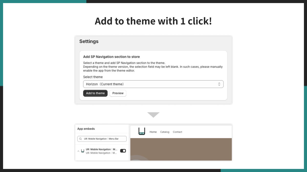 また、リンク先・アイコン・カラーなどは ノーコードで簡単にカスタマイズ可能です。さらに 1 クリックでテーマに追加できるため、エンジニアに依頼することなく、マーチャント自身で即日導入が可能です。