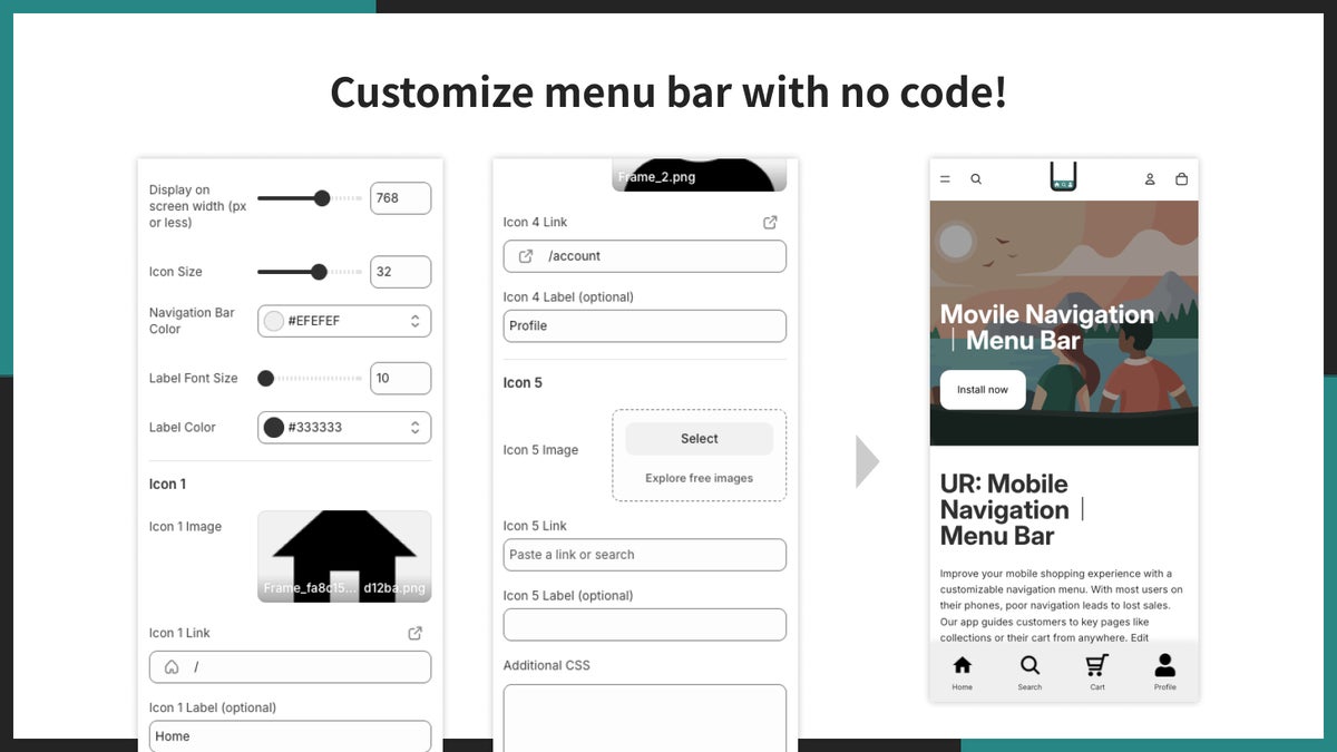 「UR: Mobile Navigation|Menu Bar」は、モバイル表示時に追従型のボトムメニューバーをストアへ追加し、回遊性とコンバージョンの向上を支援するノーコードアプリです。