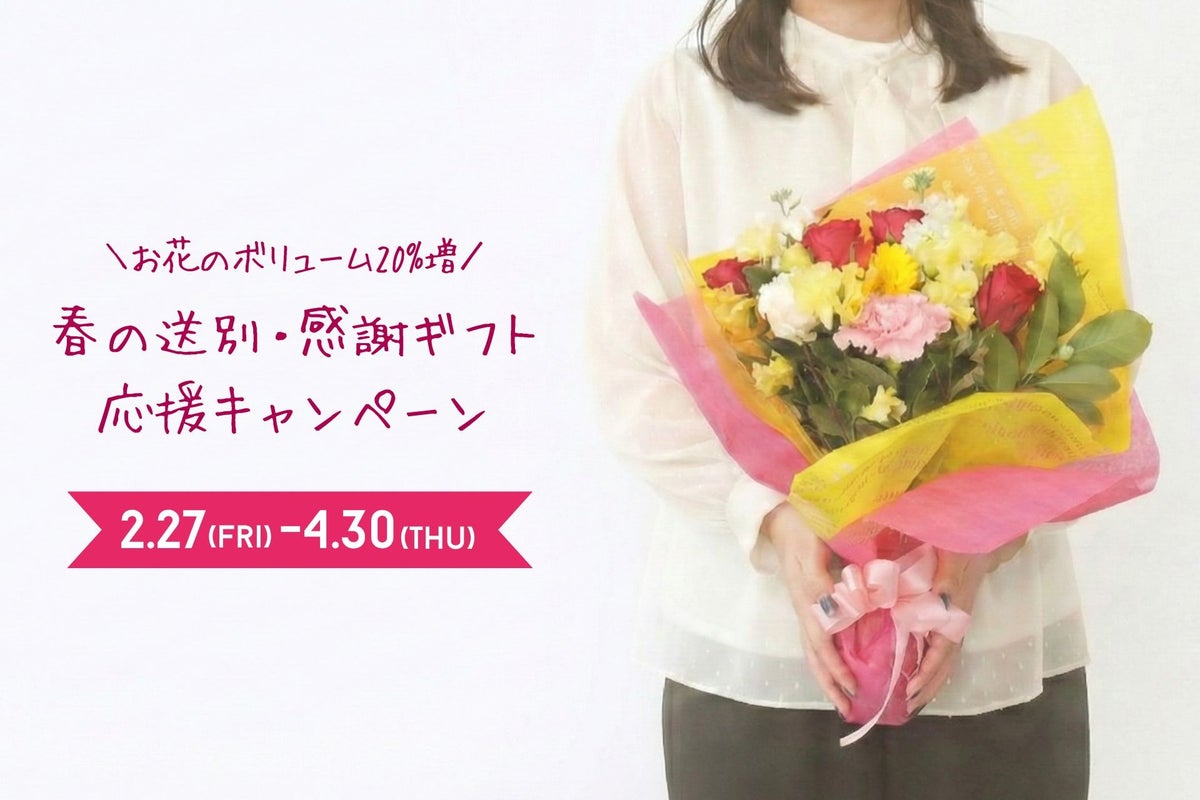 キャンペーン期間中に成立した企画を対象に、花束を同価格でボリューム20%増でお届けします。申請やクーポン入力は不要で、特典は自動適用されます。