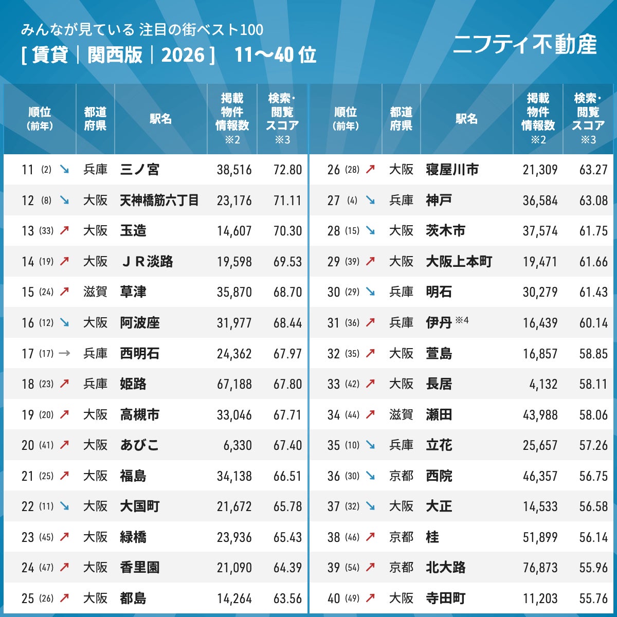 注目の街ベスト100 年間ランキング2026 関西版 11~40位