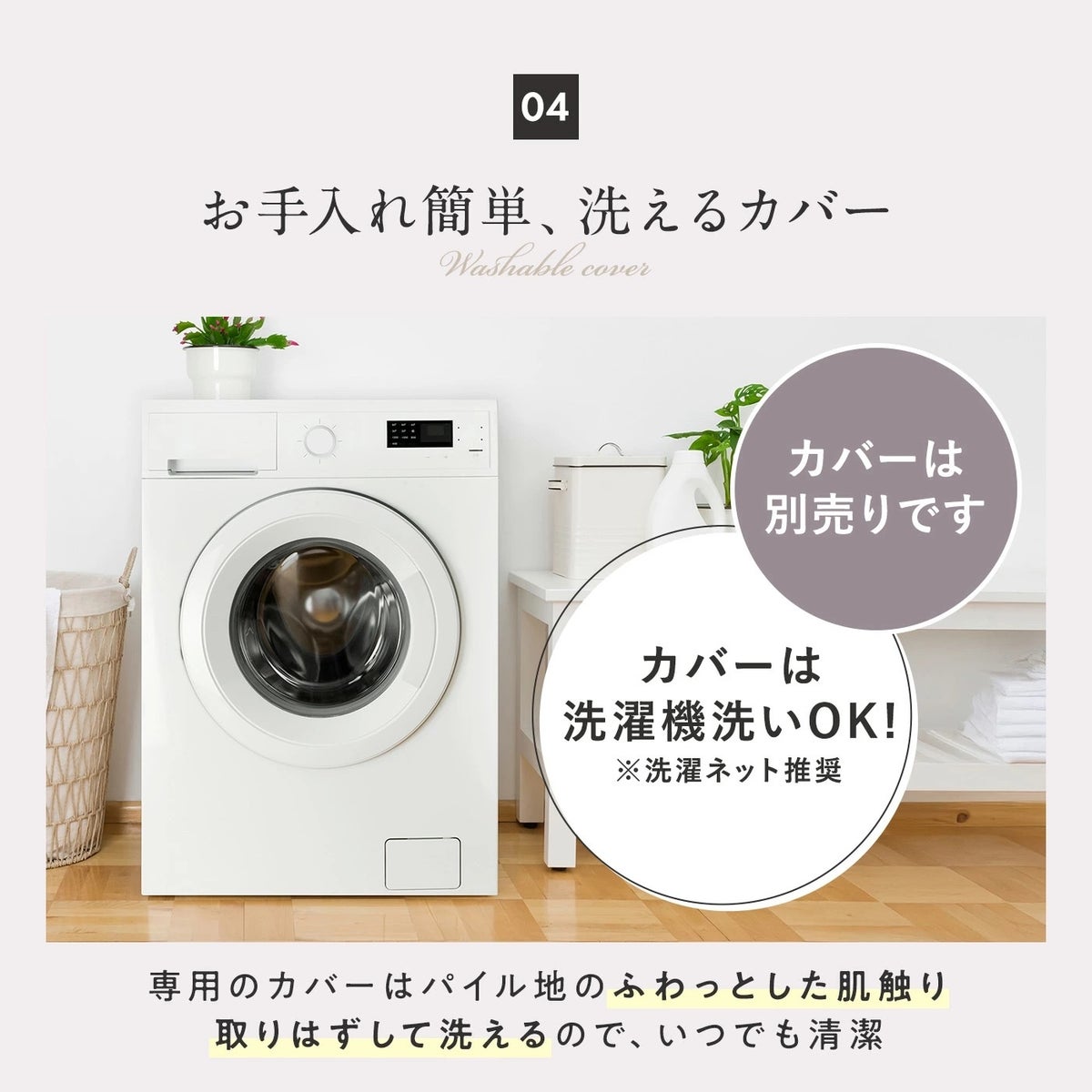 ワイドサイズ設計は全身をゆったりと支え、仰向け寝から横向き寝まで幅広く対応。カバーは取り外して洗濯ができるため、日常的に清潔にお使いいただけます。
