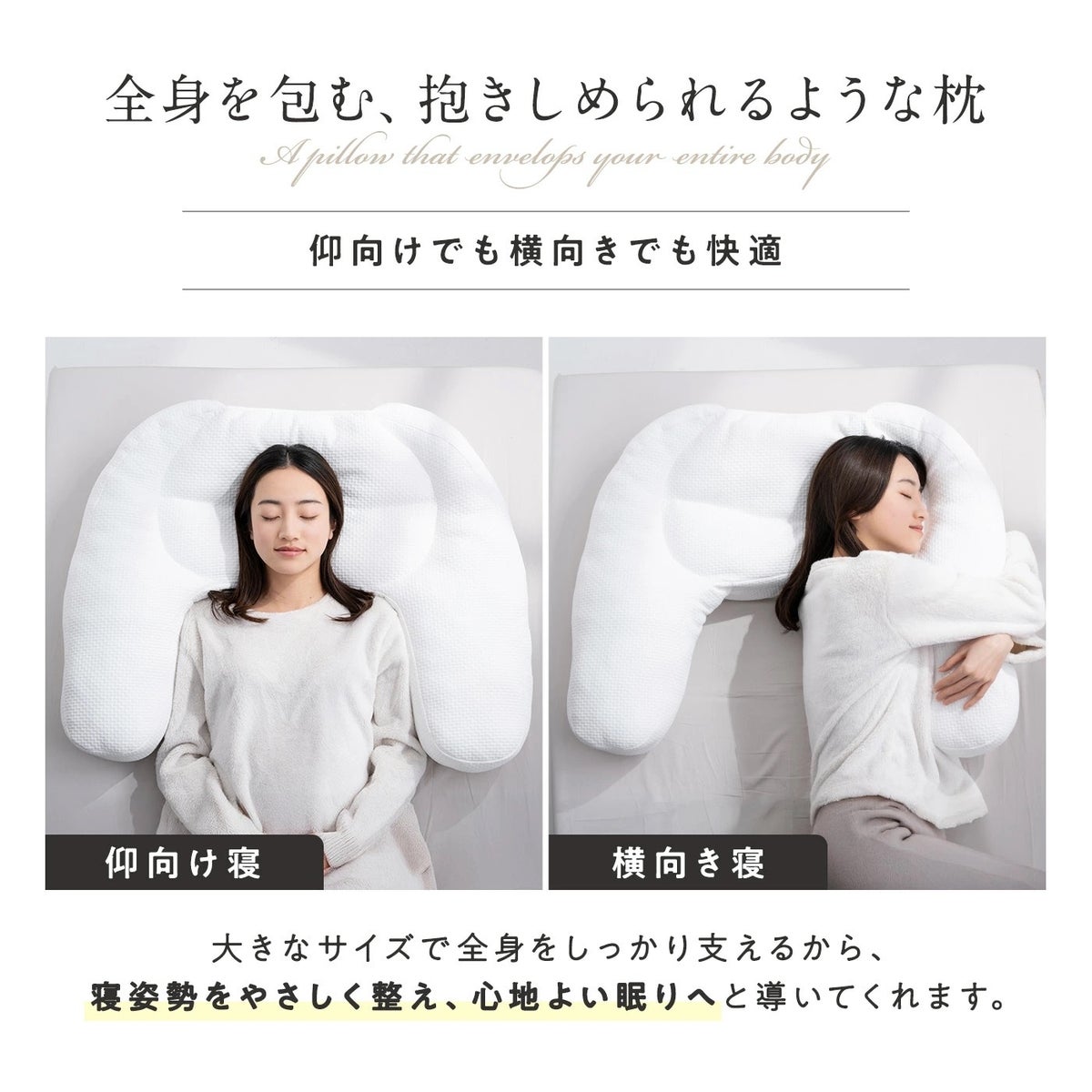 仰向け寝では頭から腕まわりまでゆったりと支え、安心感のある寝心地に。横向き寝では抱きつくことで身体の収まりがよく、腕や肩まわりのスペースを確保しやすい設計となっています。