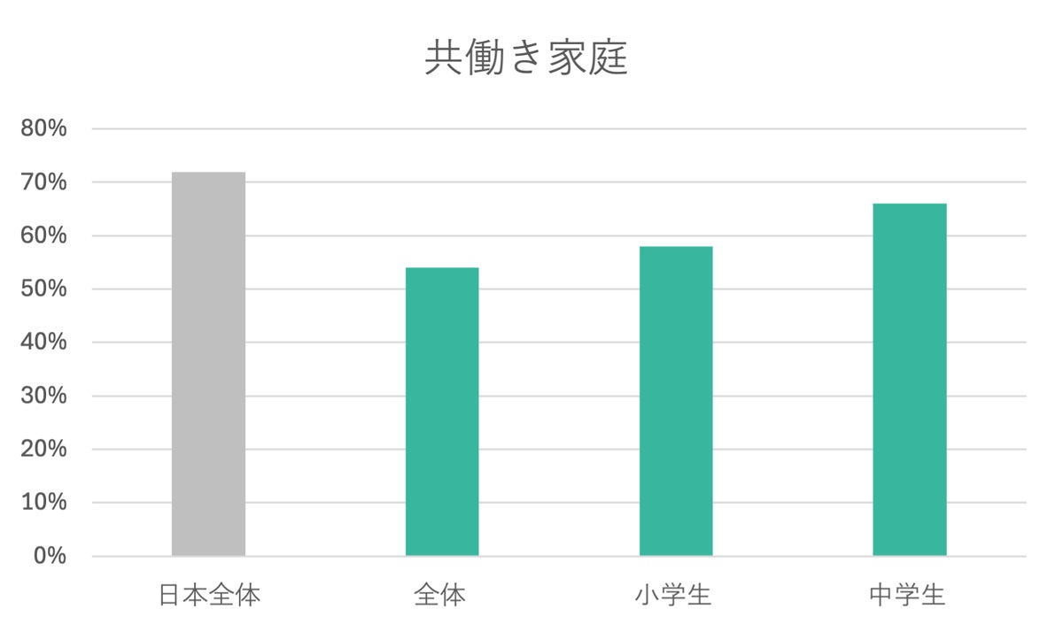 共働き家庭の割合は低い共働き家庭の割合は、54%でした。これは、日本全体の共働き家庭の割合約7割を下回ります(詳細4)。