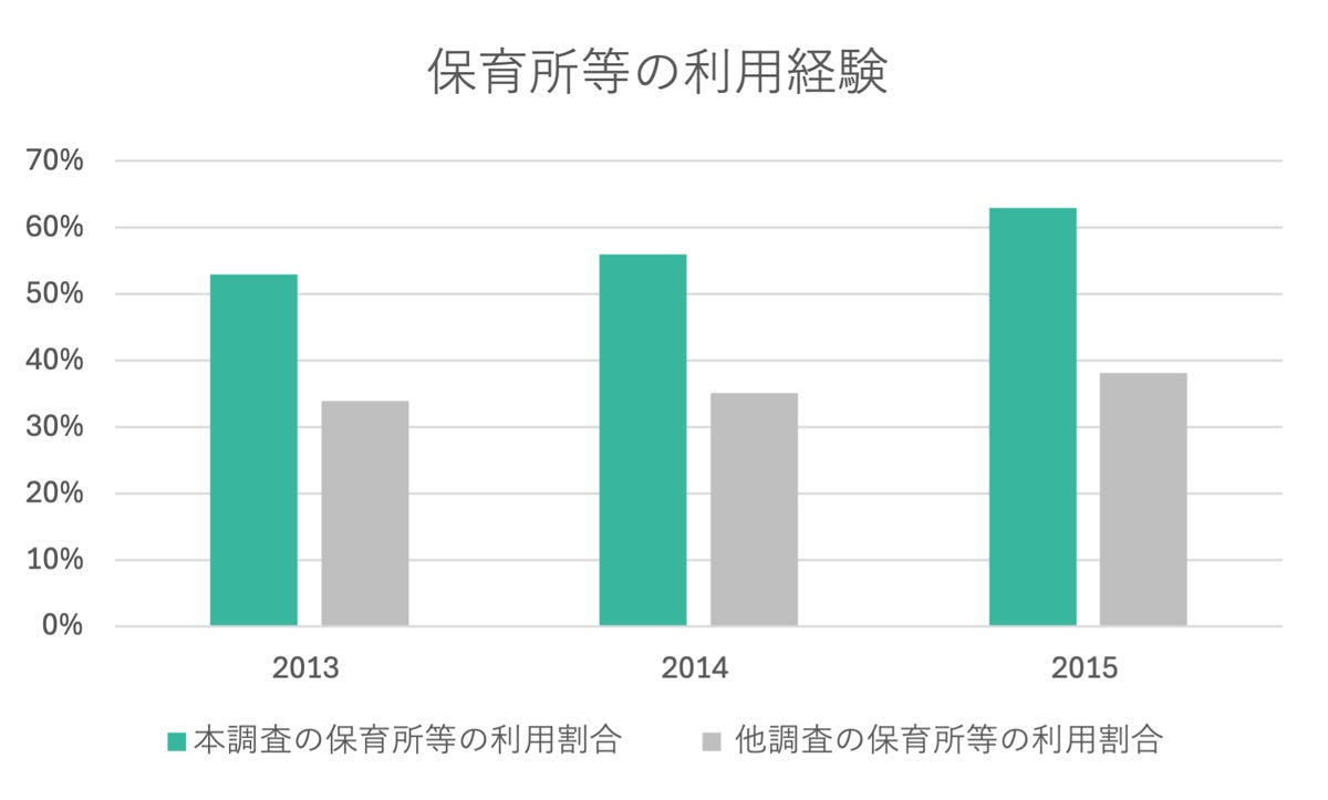 保育所等の利用経験は高い傾向保育所等の利用経験は、他調査よりも利用割合が20ポイント高くなりました(詳細3)。