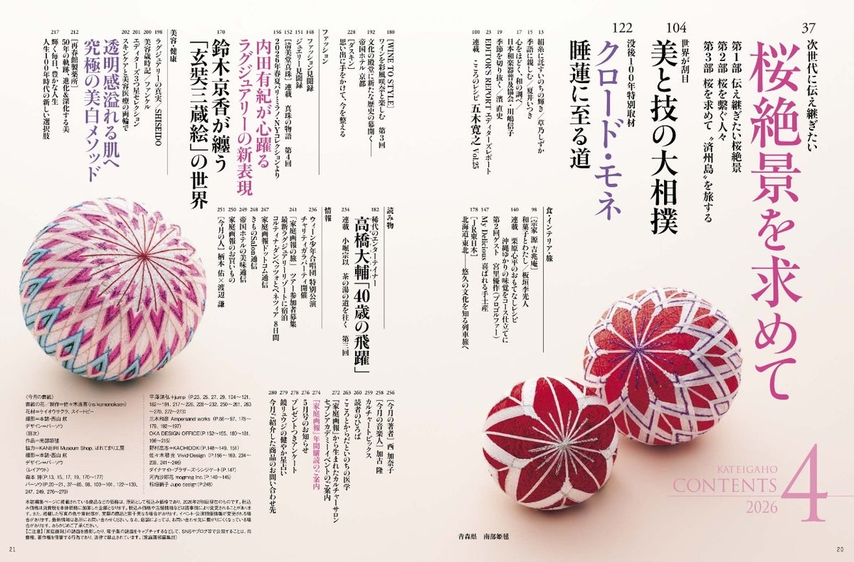 株式会社世界文化社は、『家庭画報 4月号』を2月28日(土)に発売します。巻頭特集「桜絶景を求めて」では、桜名所や桜守の取材を通して、桜の専門家とともに「新・桜100景」をご紹介します。「クロード・モネ 睡蓮に至る道」では、没後100年を記念した特別取材が実現。さらに、撮り下ろし「高橋大輔 40歳の飛躍」、「鈴木京香が纏う 玄奘三蔵絵の世界」、対談「柄本 佑+渡辺 謙」など、春爛漫を満喫する企画満載でお届けします。