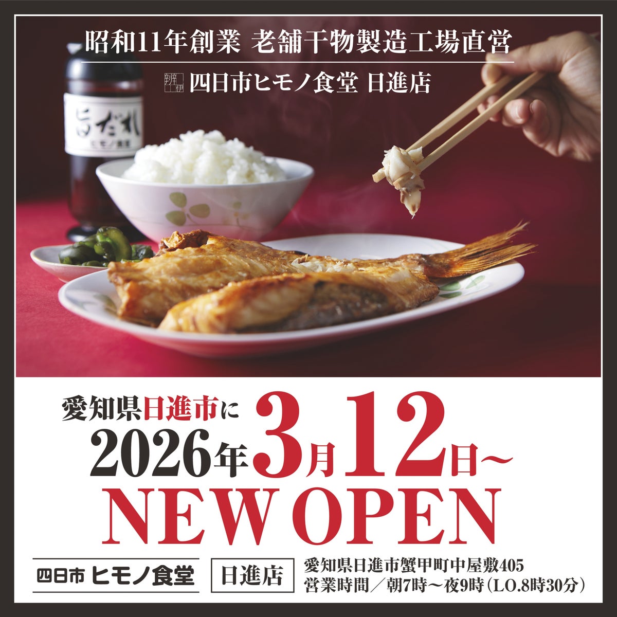 株式会社四日市ひもの食堂(本社:三重県四日市市、代表取締役:鈴木貴視)は、干物定食専門店「四日市ヒモノ食堂 日進店」を2026年3月12日(木)にグランドオープンいたします。