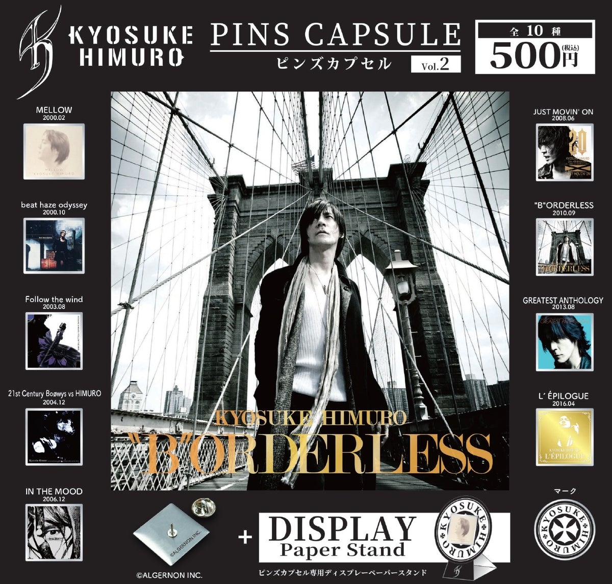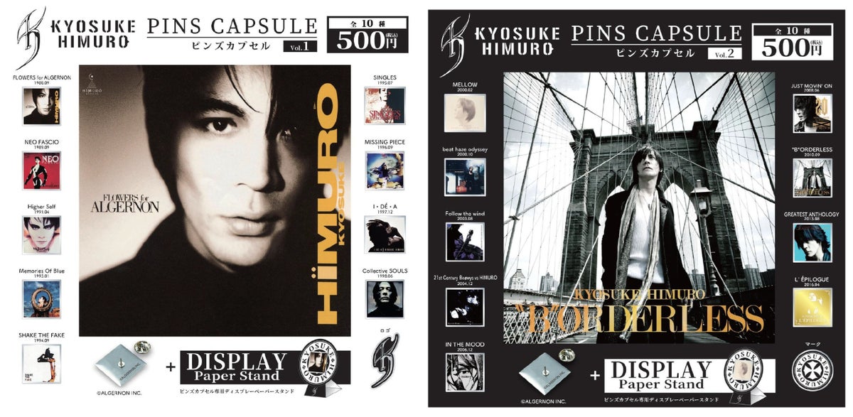 「氷室京介」のこれまでのアルバムに使用されたジャケット・アートワークとロゴマークを基にデザインしたピンバッジ(ピンズ)が専用台紙と共にカプセル内に収納されており、コレクションにも最適です。