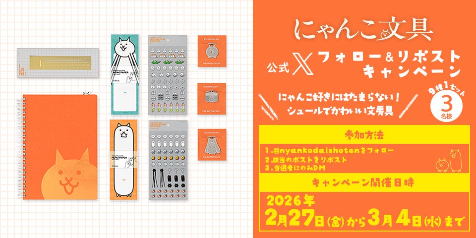 本日より、にゃんこ大商店 公式Xアカウント(https://x.com/nyankodaishoten)にて「にゃんこ文具 コンプリートセット」が抽選で3名様に当選するキャンペーンを実施中です。