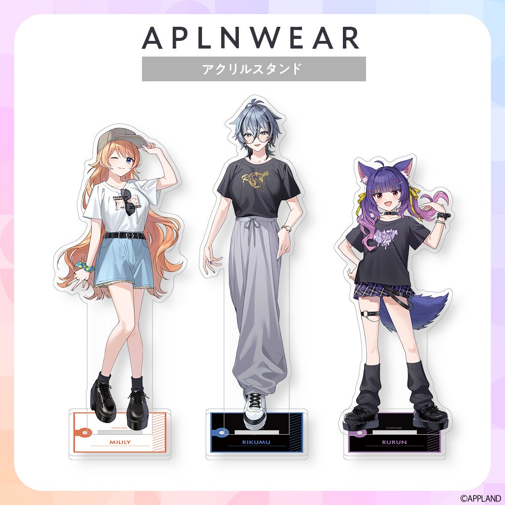 『アプランウェア』第4弾では、七星みりり、リクム、ルルン・ルルリカをイメージしたカジュアルで着やすいTシャツに加え、本アパレル着用のイメージビジュアルを使用したアクリルスタンドや缶バッジなど、全4種類のグッズが登場!