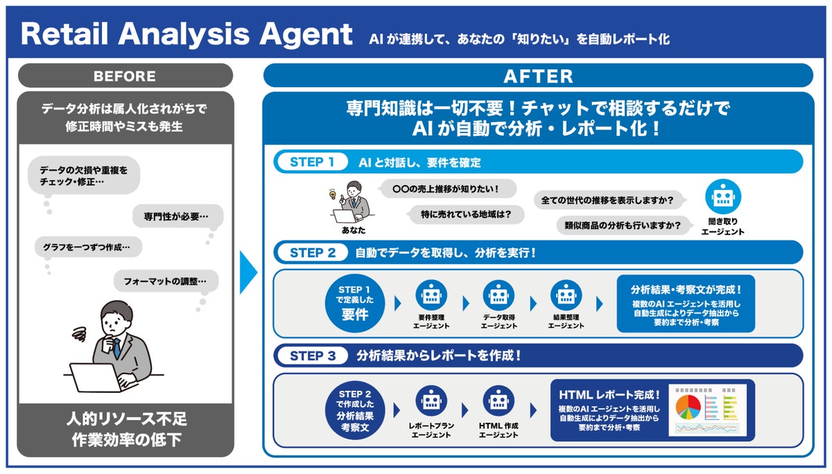 株式会社アドインテ(本社:京都府京都市、代表取締役:十河 慎治、以下「アドインテ」)は、この度、リテールメディアにおける高度な顧客理解とデータ活用を支援するAIエージェント『Retail Analysis Agent(リテール アナリシス エージェント)』を発表いたします。 データ分析の専門知識がなくてもAIとの対話を通じて深いインサイトを導き出し、現場の誰もがデータを武器にできる、新しいリテールマーケティングの形を提案します。