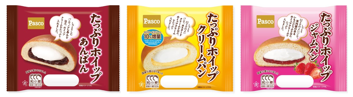 敷島製パン株式会社(Pasco)は「たっぷりホイップあんぱん」「たっぷりホイップクリームパン」「たっぷりホイップジャムパン」を、2026年3月1日(日)より東北・関東・中部・関西・中国・四国・九州地区にてリニューアル発売します。