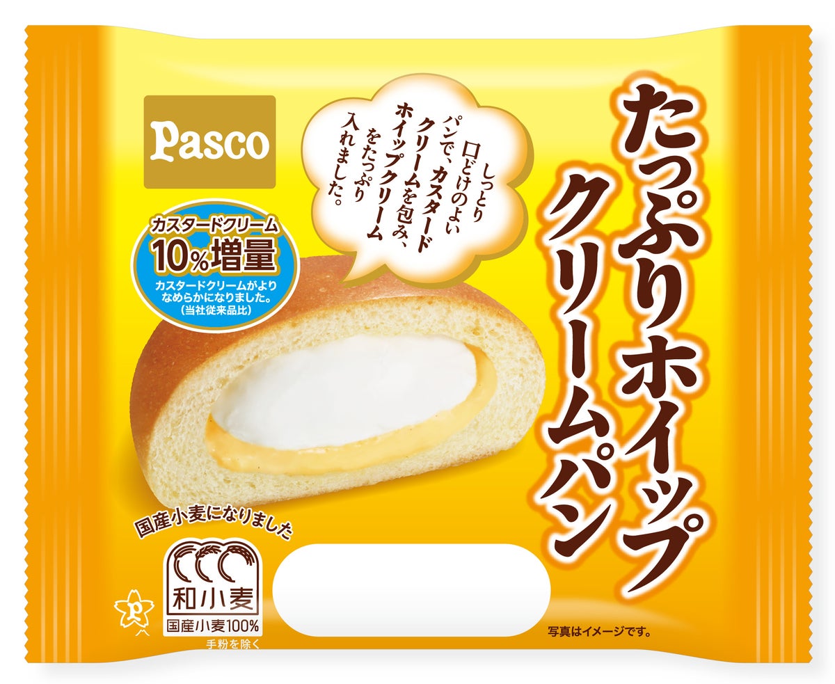 たっぷりホイップクリームパン国産小麦の小麦粉を100%使用(手粉を除く)した、しっとり口どけのよいブリオッシュタイプのパンで、よりなめらかになったカスタードクリームを包み、ホイップクリームをたっぷり入れました。
