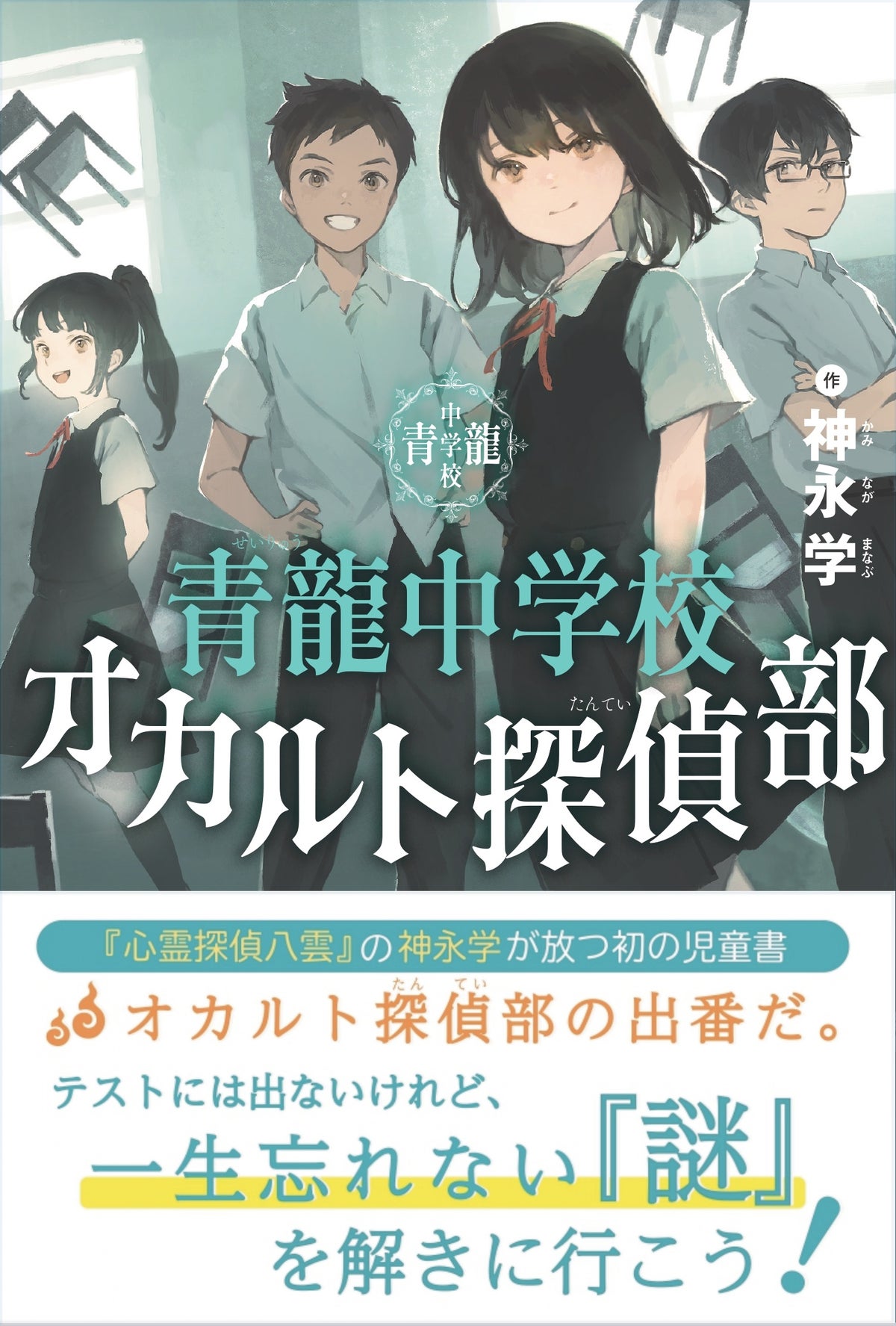 『心霊探偵八雲』『怪盗探偵山猫』シリーズなど、数々のヒット作を生み続け、幅広い層から人気の小説家・神永学氏が、自身初の児童書として『青龍中学校オカルト探偵部(せいりゅうちゅうがっこうおかるとたんていぶ)』を世に送り出しました。物語の舞台は中学校。学校に起こる怪現象に、春菜、夏彦、冬弥、そして幽霊の秋乃、3人+1人?の中学生たちが立ち向かう、ミステリとオカルトが融合したスリリングなストーリー。