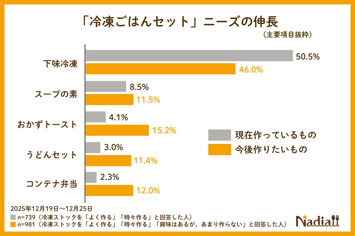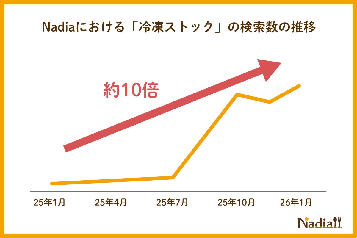 実際にNadia内の検索データ(※2)でも、「冷凍ストック」に関連する検索数は、2025年1月と2026年1月の比較で約10倍と急増傾向にあります。