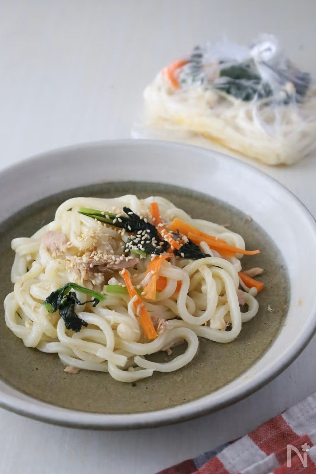 冷凍うどんと具材をまとめて冷凍しておけば、食べたいときに電子レンジで加熱するだけ!