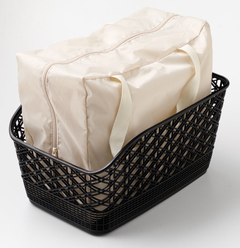 自転車で送り迎えをする際も、大きめの自転車かごであれば、すっぽり収まるサイズ感を実現しました。(収納バッグサイズは幅43 x 奥行37 x 高さ21cm)