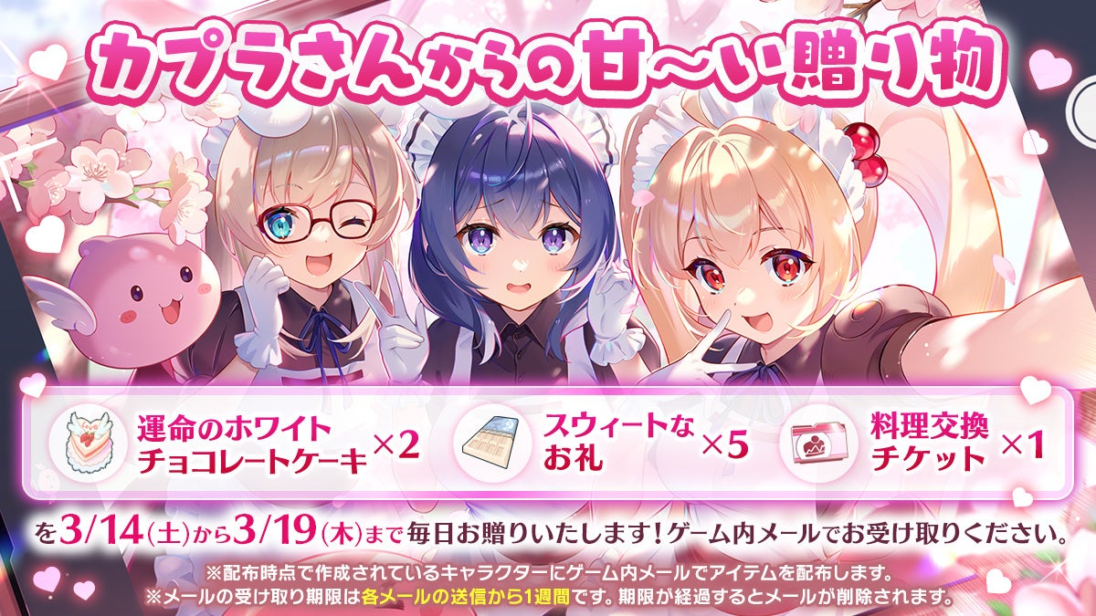 「運命のホワイトチョコレートケーキ」「スウィートなお礼」「料理交換チケット」を獲得できます。