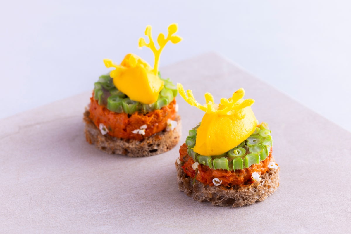 シェフ特製のセイヴォリーもはちみつをアクセントに用いたイエローカラーが映える彩り豊かなメニューが勢ぞろい。サフランの上品な香りをほんのりまとわせたフィッシュテリーヌに、甘酸っぱく爽やかなマンゴーチャツネをアクセントに効かせた「ゴールデンハイブ・サフランフィッシュテリーヌサンド」はハニカム型の華やかなイエローカラーが目をひく一品です。パプリカ、玉ねぎ、ズッキーニ、茄子をそれぞれ丁寧に火入れし、旨味を引き出してからじっくり煮込み、キャロットバターと合わせたベジタリアンメニュー「スプリングラタトゥイユ」やパイ生地をサクッと焼き上げ、ジューシーなスモークタンドリーチキンを詰めて、レモンハニーキャビアをあしらった「タンドリー・ヴォル・オ・ヴァン」など、見た目も鮮やかで素材の旨味をお楽しみいただける品々が並びます。