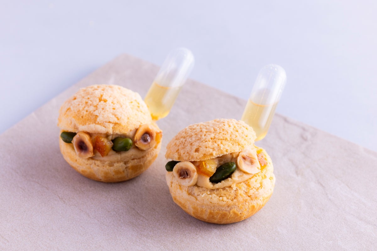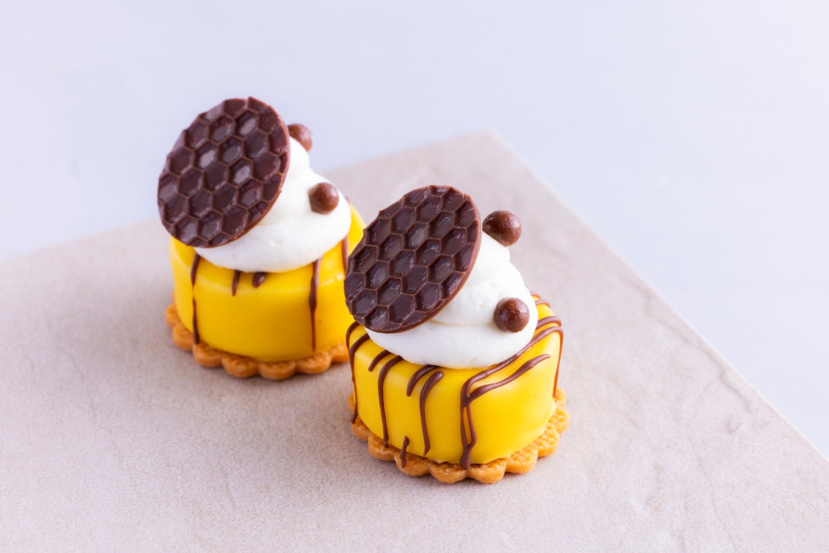 まず目を引くのは黄金のジュレがきらめく「ゴールデンハニーポット」。さっぱりとしたヨーグルトムースに、はちみつの豊かな甘みとカモミールのやわらかな香りを閉じ込めたジュレを重ね、ハニーポットをイメージした上品な味わいに仕上げました。鮮やかなイエローとパープルのエディブルフラワーが春らしさを添える「瀬戸内レモンフラワームース」は、瀬戸内レモンのまろやかな酸味を生かしたムースにコクのある生クリームの相性が抜群です。アーモンドやヘーゼルナッツを香ばしくキャラメリゼして丁寧に仕上げたプラリネカスタードクリームにアプリコットとオレンジのジャムをそっと忍ばせた「シュー・ハニープラリネ」。ひと口かじるとナッツの濃厚なコクとアプリコットの酸味がふわっと広がり、絶妙なバランスのハーモニーを奏でます。はちみつをとろりと垂らせば、奥行きある甘味が加わり、食べ進めるごとに表情が変わる遊び心溢れるシュークリームです。まるでハチの模様をイメージした可愛らしいデザインの「バジー・マカロン」にはレモンとパッションフルーツの軽やかで爽やかな口どけのガナッシュをサンドしました。