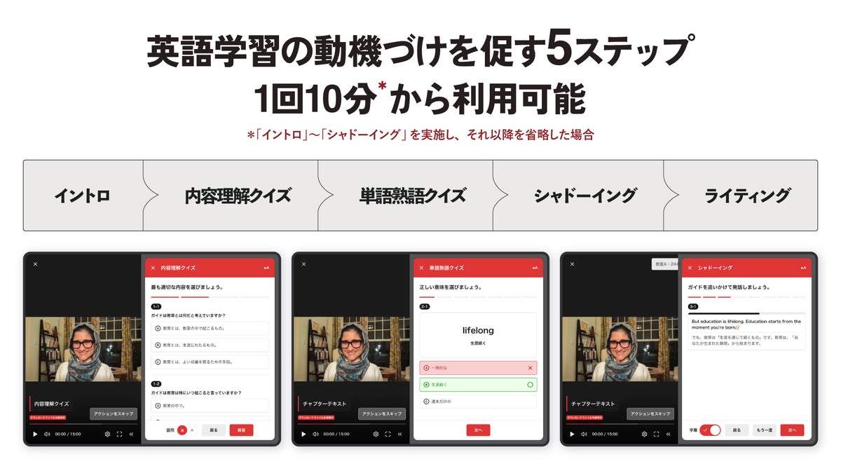 各プログラムは、リスニング・単語熟語理解・シャドーイング・ライティングと、英語スキルを網羅的に育むステップで構成されています。動画内にはファシリテーションもあり、先生は手軽に授業を進行することが可能です。