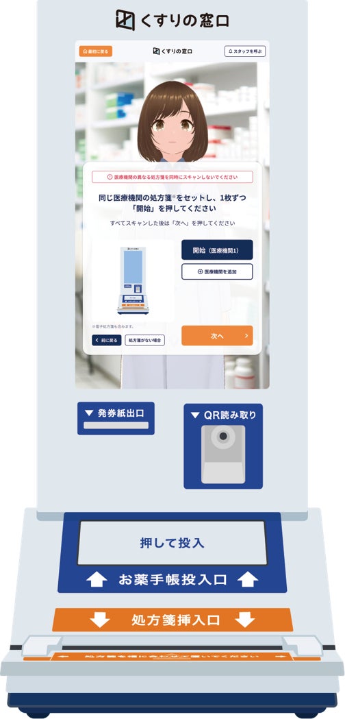 「AI受付機」は、人を介さずに、処方せんの受付、紙のお薬手帳の回収、受付票の発券、調剤完了の呼び出しといった受付業務を実施するほか、自動で処方せん情報入力も可能な、株式会社くすりの窓口が展開するサービス機器です。2025年8月から15店舗で検証を行い、3月4日(水)より本格導入を開始し、2026年度中に約290店舗※1)の導入を目指します。