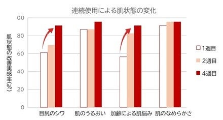 セルプラスを連続使用することで肌状態の改善を実感した被験者の割合は、肌のなめらかさやうるおいについて1週目から高い実感率を示し、目尻のシワや加齢による肌悩みは2週目から実感率が高まりました。